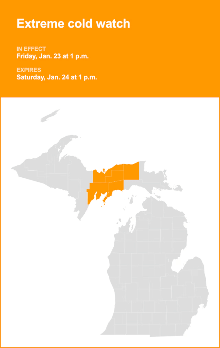 An extreme cold watch, such as the one now in effect for parts of the Upper Peninsula, is issued when dangerously cold air temperatures or wind chill values are possible in the coming days. While conditions are not yet certain, residents are urged to prepare in advance, adjust travel plans, and take steps to protect people, pepets and property. Officials also recommend ensuring that vehicles have at least half a tank of fuel and that winter survival kits are up to date.